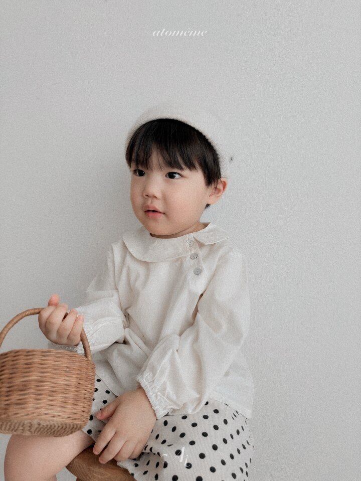 ナチュラルなコットンの風合いがたまらない、大人顔負けのフラットブラウス。丸みのある襟とサイドボタンのデザインが、お子様の可愛らしさを引き立てます。