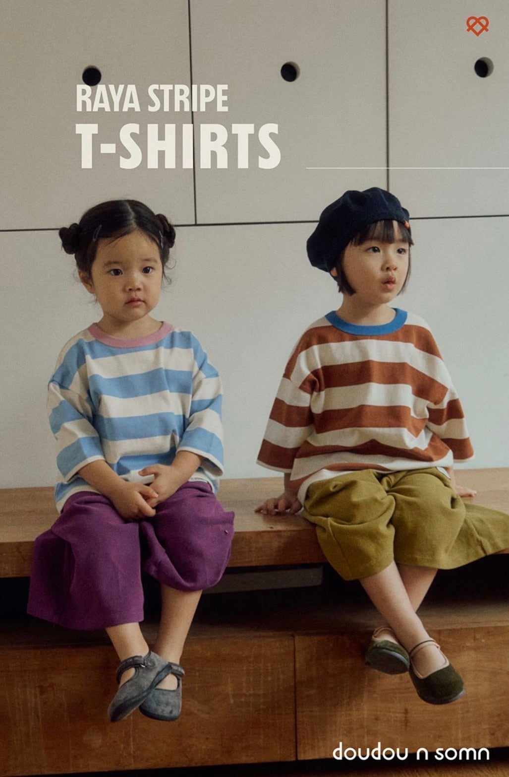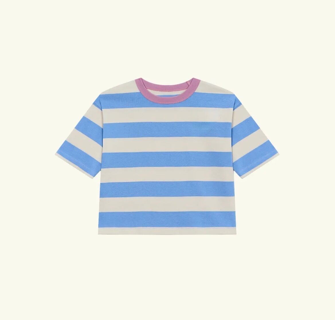 爽やかなミルキーブルーが、お子様の表情をパッと明るく引き立てます 。適度な厚みで透けにくく、デイリーに気兼ねなく着回せるおしゃれなストライプTシャツです 。