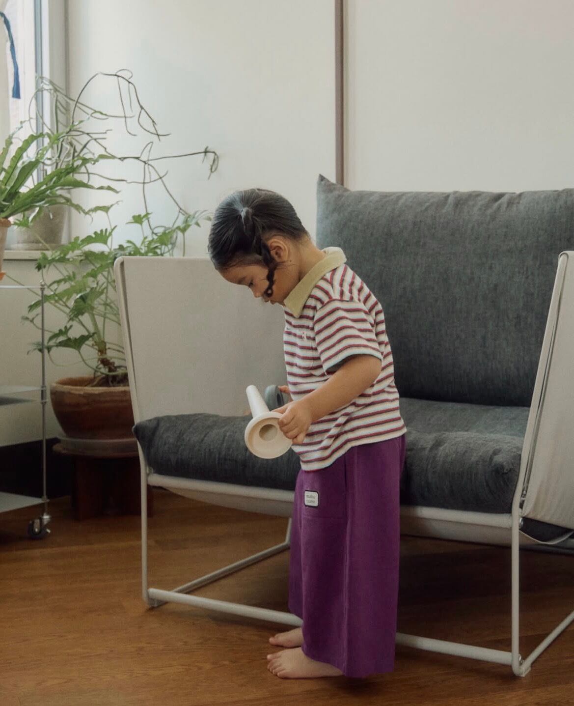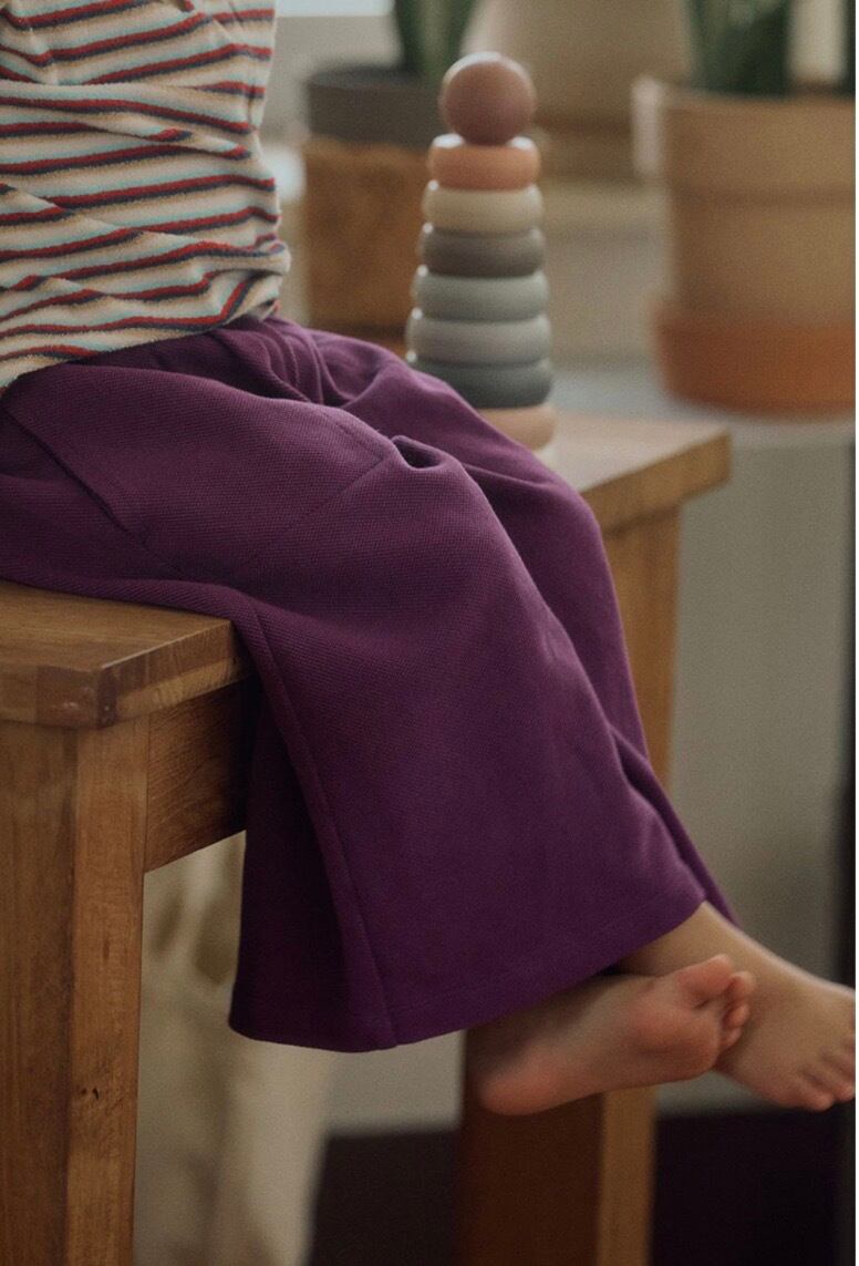 リラックス感たっぷりのワイドシルエットが、お子様の動きを妨げずこなれたスタイルを完成させます。ピケ素材特有の清潔感のあるクリーンな仕上がりと、コーディネートの主役になる鮮やかなプラムカラーが魅力の一枚です。