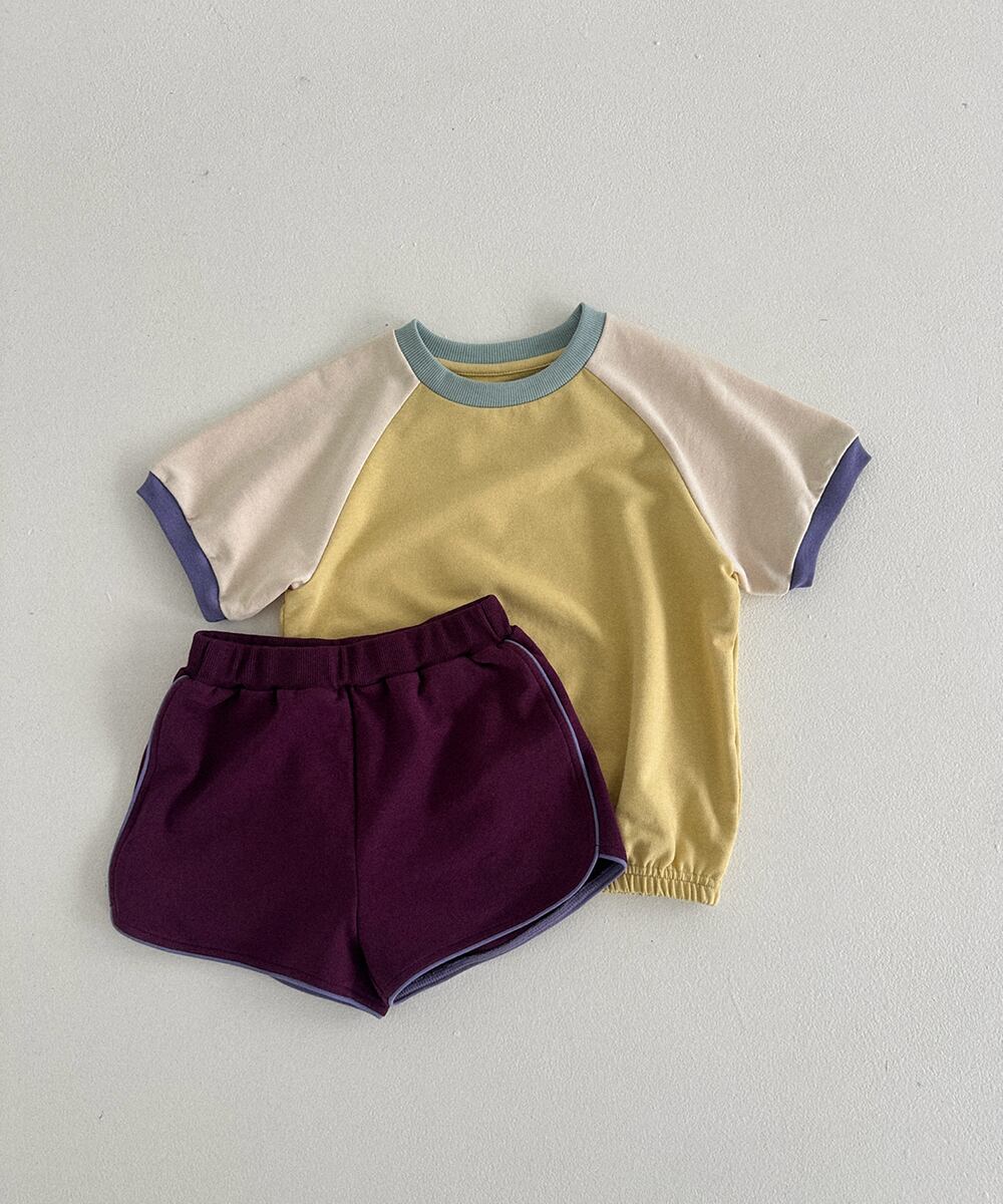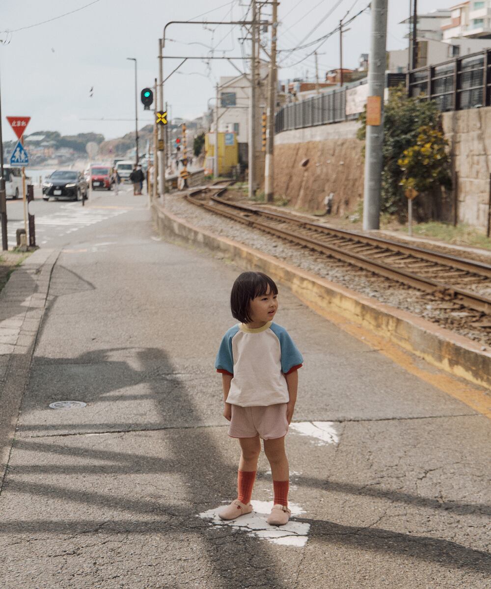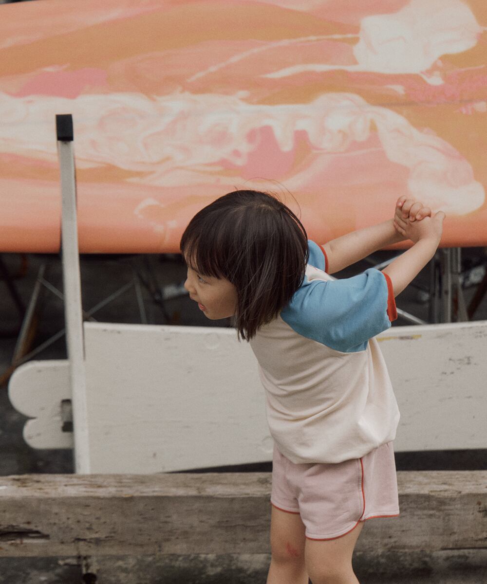 レトロな配色がかっこいい、スポーティーなセットアップ。動きやすさ抜群なので、公園でのかけっこも全力で楽しめちゃう、ママも嬉しいお洋服です 。